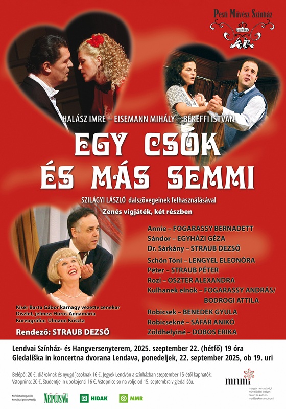 A Pesti Művész Színház nyitja meg a 2025–26-os magyar bérletes színházi évadot a Lendvai Színház- és Hangversenyteremben 2025. szeptember 22-én, hétfőn 19 órakor az Egy csók és más semmi zenés vígjátékával. A darabról: Dr. Sáfrány ügyvéd legszívesebben válóperes ügyeket vállal: ügyfelei főleg tehetős asszonyok, akik válni akarnak, vagy épp ellenkezőleg, nem akarnak válni. Az…