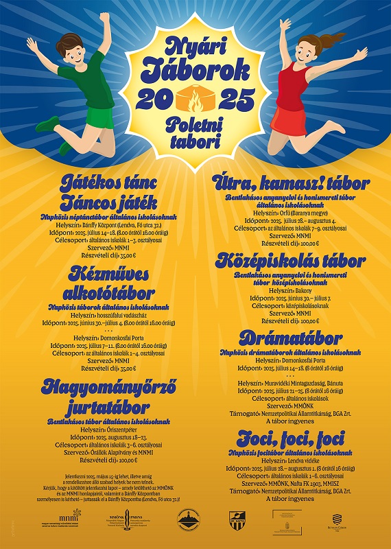 A 2025-ös évben is táborokat szervezünk a fiatalok számára több különböző helyszínen és érdekesebbnél érdekesebb tematikában. Szerezzetek felejthetetlen élményeket ezen a nyáron is velünk! Játékos tánc – Táncos játék napközis néptánctábor általános iskolásoknak Időpont: 2025. július 14–18. (8.00 órától 16.00 óráig) Helyszín: Bánffy Központ (Lendva, Fő utca 32.) Célcsoport: általános iskolák 1–3. osztályosai Szervező:…