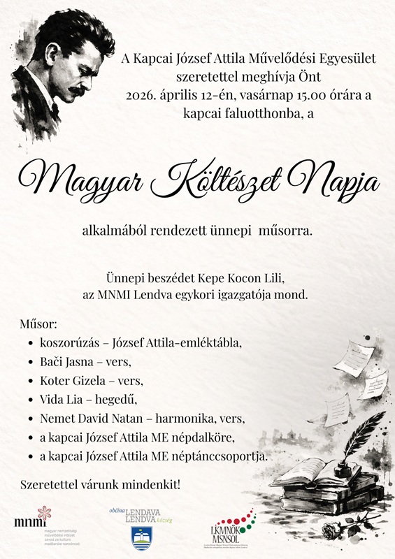 A Kapcai József Attila Művelődési Egyesület szeretettel meghívja Önt 2026. április 12-én, vasárnap 15.00 órára a kapcai faluotthonba, a MAGYAR KÖLTÉSZET NAPJA alkalmából rendezett ünnepi műsorra. Beszédet Kepe Kocon Lili, az MNMI Lendva egykori igazgatója mond. Műsor: koszorúzás – József Attila-emléktábla, Bači Jasna – vers, Koter Gizela – vers, Vida Lia – hegedű, Nemet David…