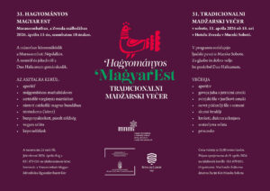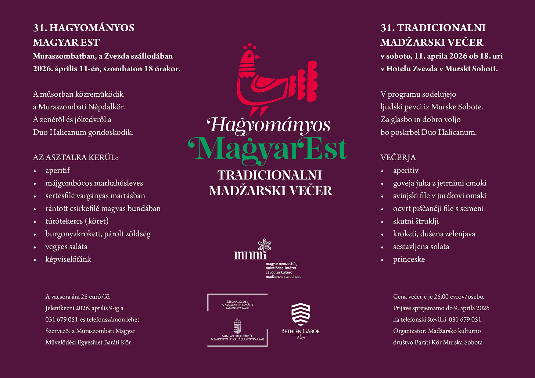 HAGYOMÁNYOS MAGYAR EST NÉPZENÉVEL Muraszombatban, a Zvezda szállodában április 11-én, szombaton 18 órakor. A műsorban közreműködik a Muraszombati Népdalkör. A zenéről és jókedvről a Duo Halicanum gondoskodik. AZ ASZTALRA KERÜL: aperitif májgombócos marhahúsleves sertésfilé vargányás mártásban rántott csirkefilé magvas bundában túrótekercs (köret) burgonyakrokett, párolt zöldség vegyes saláta képviselőfánk A vacsora ára 25…