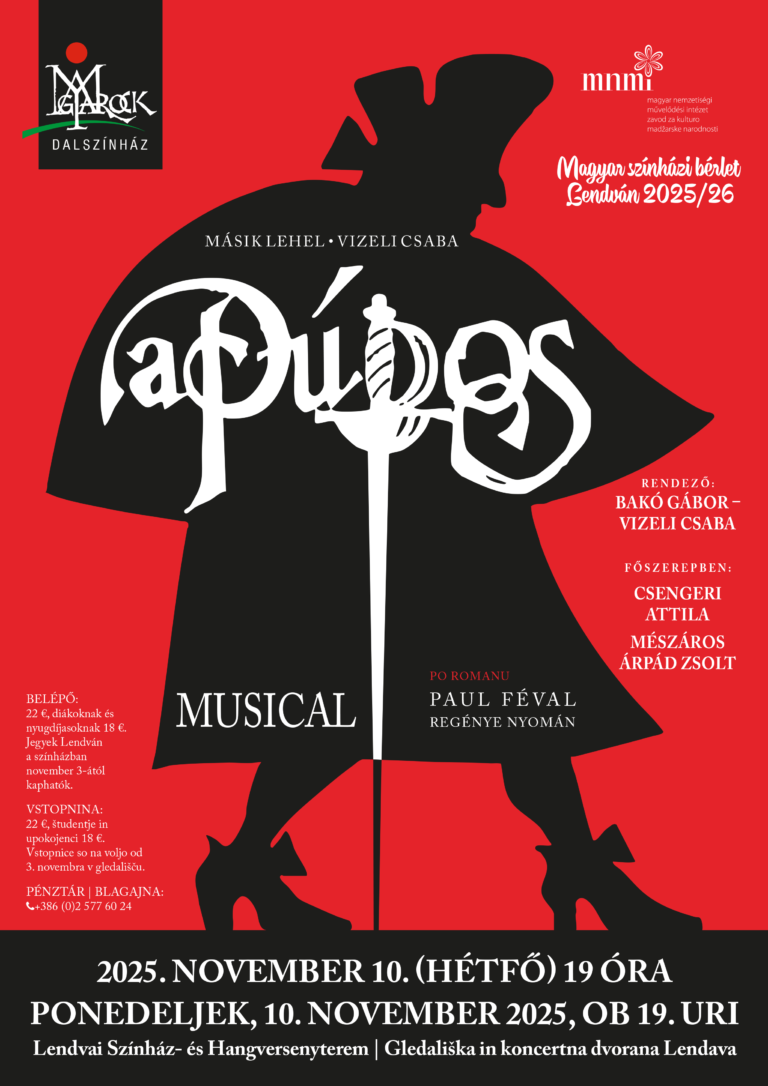 A Magyarock Dalszínház, a Szolnoki Szigligeti Színház és a salgótarjáni Zenthe Ferenc Színház koprodukciójában érkezik a 2025-ös évben az utolsó magyar bérletes színházi előadás a Lendvai Színház- és Hangversenyteremben 2025. november 10-én, hétfőn 19 órakor A púpos című musicalt.