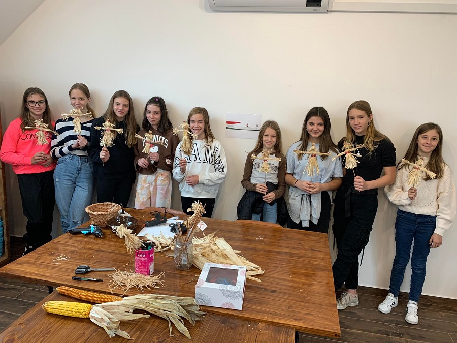 A kukoricacsuhézás is érdekes műhelymunkának bizonyult, hiszen ezzel a természetes anyaggal többen még nem dolgoztak. Az alapanyag előállításával, annak tárolásával és használatával kézműves szakember ismertette meg a gyerekekkel. Az ügyeskezű gyerekek a kézműves szakember utasításait követve madárijesztőt készítettek.