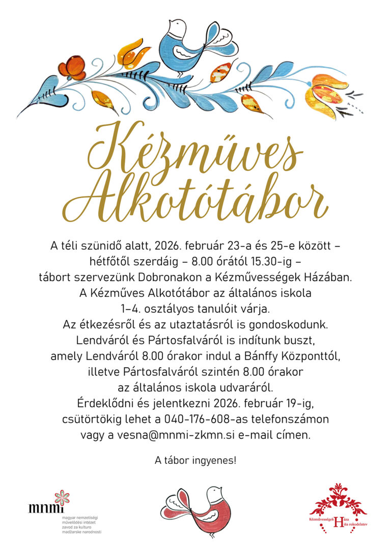 A téli szünidő alatt, 2026. február 23-a és 25-e között – hétfőtől szerdáig – 8.00 órától 15.30-ig – tábort szervezünk Dobronakon a Kézművességek Házában. A Kézműves Alkotótábor az általános iskola 1–4. osztályos tanulóit várja. Az étkezésről és az utaztatásról is gondoskodunk. Lendváról és Pártosfalváról is indítunk buszt, amely Lendváról 8.00 órakor indul a…